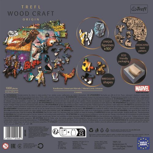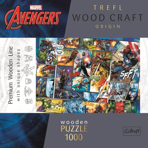 Dřevěné oboustranné puzzle TREFL z prémiové řady Wood Craft Origin se speciálně tvarovanými dílky, které jsou inspirované světem Avengers. Puzzle je vyrobeno ze silné dřevovláknité desky a vyřezáno laserem, díky čemuž jsou okraje hladké a dílky do sebe lehce zapadají.