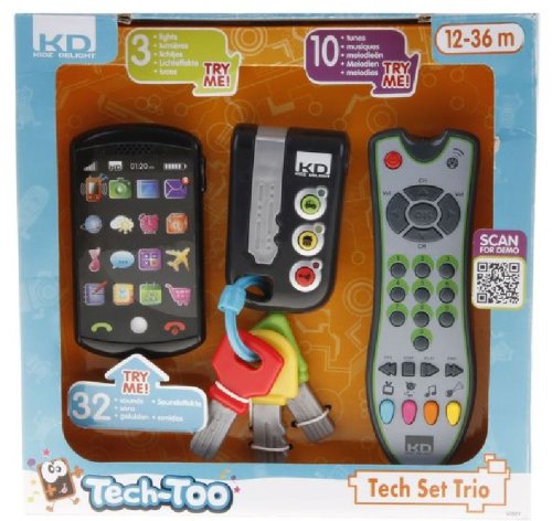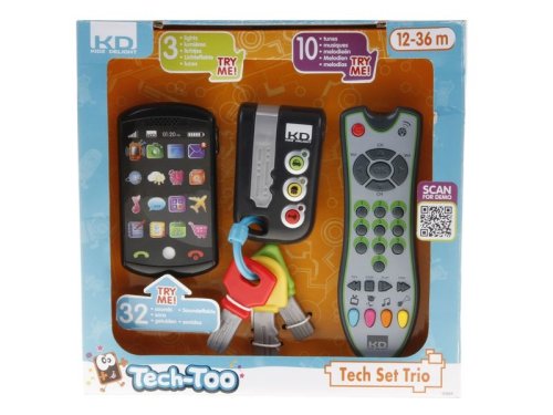 Klíče, ovladač a telefon rozvíjejí jemnou motoriku, zvídavost a vnímání zvuku. Vždyť dítě chce dělat to co maminka a tatínek. Klíče Klic klac – 3 realistické zvuky, světlo, 3 klíče s různými tvary. TV ovladač Zip Zap – Ovladač je se světlem. 60 zvuků a 10 melodií, 4 herní módy. Smarthphone – Telefon se světlem, 18 ikon na dotyk, 32 zvuků, 3 vyzváněcí tóny, automatické zpětné volání.