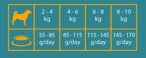 Složení: Maso a produkty živočišného původu (druběží 26 %, čerstvé kuřecí maso 10 %), obiloviny (rýže 5 %), oleje a tuky, vedlejší produkty rostlinného původu, ryba a vedlejší rybí produkty, minerální látky, ovoce (jablka 1.000 mg / kg a borůvky 1.000 mg / kg), kvasnice (500 mg / kg).