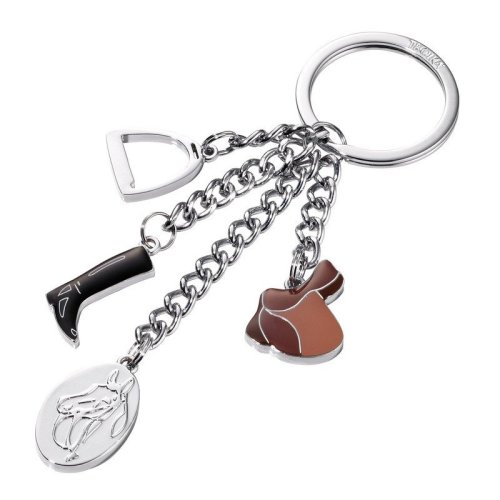 Klíčenka se 4 přívěsky - třmen, jezdecká bota, sedlo a destička s koněm. Kombinace stříbrné, černé a odstínů hnědé.<br> <br> • rozměry: 110 x 95 x 35 mm<br> • hmotnost: 56 g<br> • motiv koní - hlava koně, třmen, jezdecké boty, sedlo<br> • vhodná i jako dárek