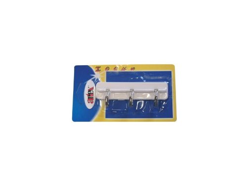 Kvalitní chromovaný drátěný věšák se 3 výklopnými hačky na plastové základně délky 10.5 cm. Možnost nalepení na stěnu i na podhled, kovové háčky jsou výklopné. EAN 8001579202279