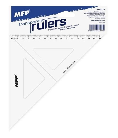 Školní plastové pravítko pravoúhlý trojúhelník s ryskou o délce 16 cm. Pravítko svírá úhly 45°/90°/45°.<br> <br> Barva: transparentní<br> <br> Pravítko je zdravotně nezávadné a neobsahuje ftaláty.