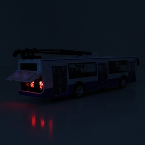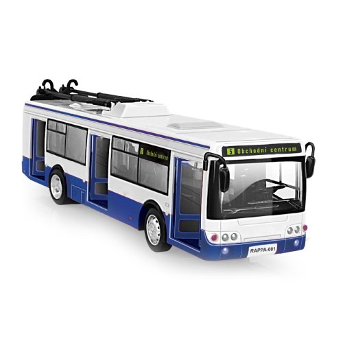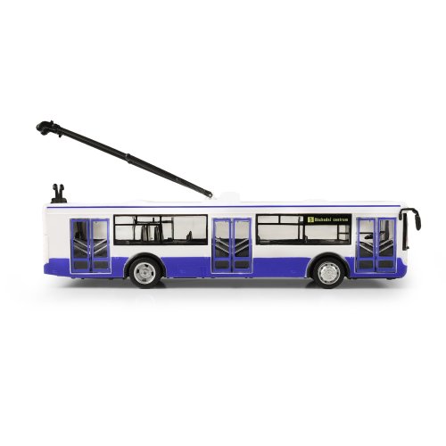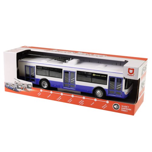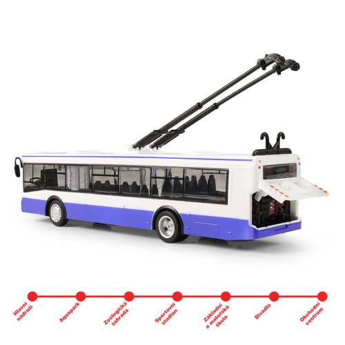 Rychle nastoupit, zavřít dveře a jedeme! Originální trolejbus, který oznamuje stanice v českém jazyce a jezdí na zpětný chod. Dveře lze manuálně otevřít a zavírají se pomocí tlačítka umístěného na střeše vozu. Při každém otevření se ozve hlášení, při zavření navíc blikají přední světla trolejbusu. Trolejbus je vyroben v délce 28 cm a měřítku 1:43. Vyžaduje použití 3 ks baterií typu LR44/AG13, které jsou součástí balení. Tahle unikátní hračka nesmí chybět fandům ekologické dopravy!
