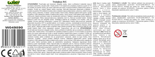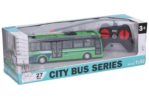 Trolejbus RC na dálkové ovládání. Rozměry 21x5,3x6 cm. Frekvence 27MHz. Světelné efekty. Bateriový pack 3,7V do trolejbusu součástí, 2xAA do ovladače nejsou součástí. USB kabel součástí. Přepínač ON/OFF na spodní straně trolejbusu.