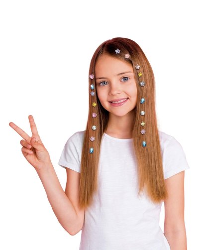Kreativní sada 24 diamantů a 24 spon s aplikátorem. Diamant vložte do vrchní části aplikátoru. Do spodní části vložte přezku. Do přezky ve spodní části vložte slabý pramen vlasů a umístěte ho tam, kde chcete diamant připevnit. Zmáčkněte aplikátor, abyste diamant na vlasech zafixovali přezkou. Drahokam zůstane na pramenu vlasů připevněný. Rozměry balení 22 x 12 x 6 cm Vhodné pro děti od 5 let
