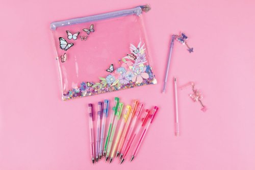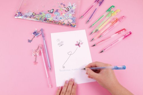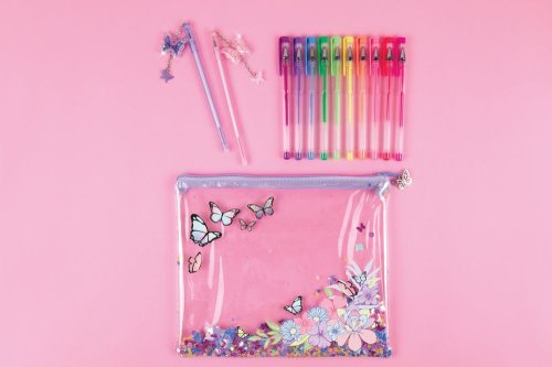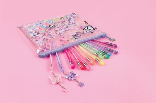 12 krásných gelových per uložené v průhledném pouzdru s přesýpajícími se glitry.