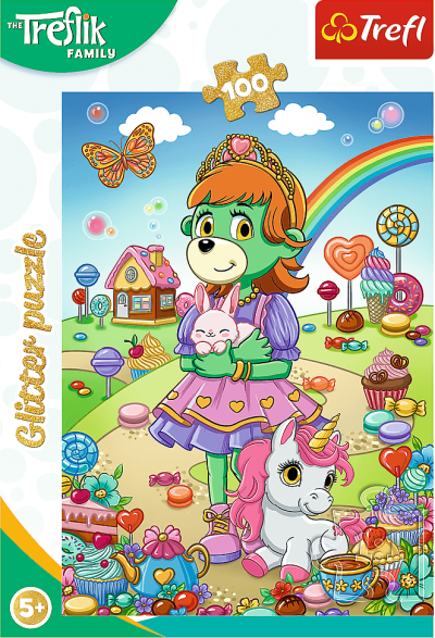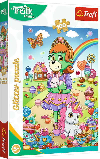 Třpytivé puzzle se 100 dílky s motivem postaviček rodiny Treflíků.