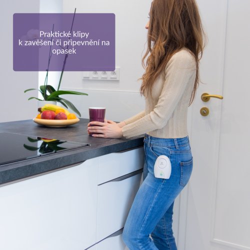 Praktické klipy Obě jednotky mají praktický klip, který slouží k zavěšení či připevnění na opasek. S chůvičkou se tak můžete pohodlně pohybovat.