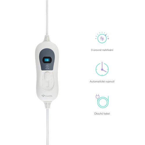 Nahřívací dečka TrueLife je ideální pro chladné dny. Jednoduše ji zapnete a během okamžiku vám poskytne příjemné zahřátí. Je použitelná nejen do postele, ale i k posezení u televize a potěší hlavně ty, kteří jsou zimomřiví, nebo mají syndrom studených nohou. Teplo působí pozitivně na uvolnění svalů a může pomoct při bolestech zad, při únavě po sportu a dalších problémech pohybového aparátu. Teplotu nahřívání si zvolíte sami ze tří nabízených úrovní. Při používání dečky se nemusíte bát přehřátí či dokonce popálenin. Dečka je vybavená dvěma bezpečnostními funkcemi – časovačem a funkcí automatického vypnutí. Díky tomu si sama hlídá svou teplotu. Před případným znečištěním ji ochrání povlak, který lze snadno prát v pračce. Jeho povrch je vyrobený z hebkého microfleecu, příjemného na dotek. HeatBlanket 0403 nabídne i finanční benefit v podobě úspory za energie. Zahřeje vás totiž mnohonásobně levněji, než vyhřívání místnosti přímotopem.