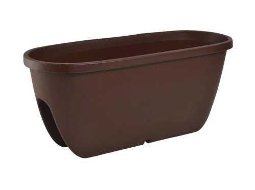 Plastový hnědý oválný truhlík s jemnými glitry. Truhlík je určený na balkónová zábradlí o maximální šířce 6 cm. Na dně má vylisovaný výřez, který se směrem vzhůru zužuje, tím se položí a upevní na zábradlí. Prodáváme v délce 60cm v různých barvách.