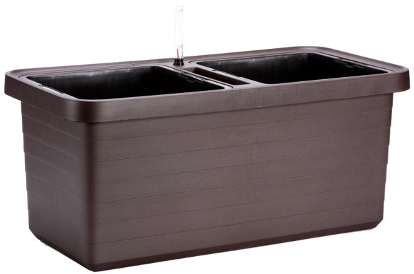 Velkoobjemový samozavlažovací truhlík v moderním designu. Obsahuje 2 samostatně vyjímatelné nádoby. Skvěle se hodí pro pěstování zeleniny, květin, drobných keřů a bylin. Zalévání je beztarostné - má velkou zásobárnu vody (18 l) s hladinoměrem, dostatečně velký otvor pro zalévání a přepad vody. Je vhodný na terasu, balkón a do zahrady. Příslušenství: 6 koleček, 2 knoty, 1 hladinoměr, 4 úchyty. Šířka: 78 cm, výška: 35 cm, hloubka: 39 cm. Rozměry jednotlivé nádoby: 33 x 33 cm, objem jednotlivé nádoby: 18 l.