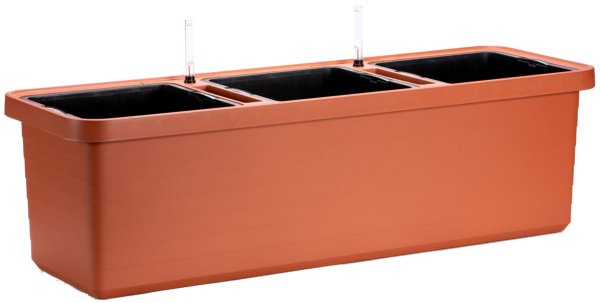 Velkoobjemový samozavlažovací truhlík v moderním designu. Obsahuje 3 samostatně vyjímatelné nádoby. Skvěle se hodí pro pěstování zeleniny, květin, drobných keřů a bylin. Zalévání je beztarostné - má velkou zásobárnu vody (27 l) s hladinoměrem, dostatečně velký otvor pro zalévání a přepad vody. Je vhodný na terasu, balkón a do zahrady. Příslušenství: 8 koleček, 3 knoty, 2 hladinoměry, 6 úchytů. Šířka: 117 cm, výška: 35 cm, hloubka: 39 cm. Rozměry jednotlivé nádoby: 33 x 33 cm, objem jednotlivé nádoby: 18 l.