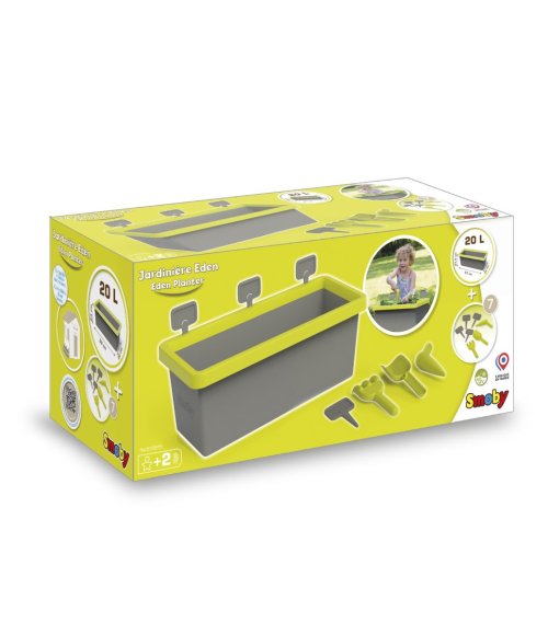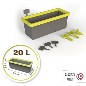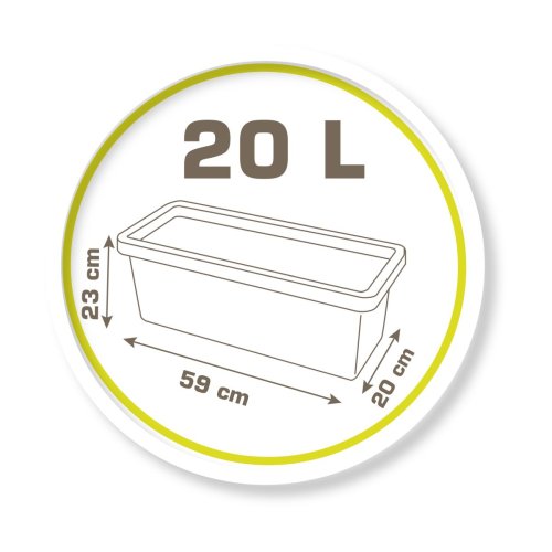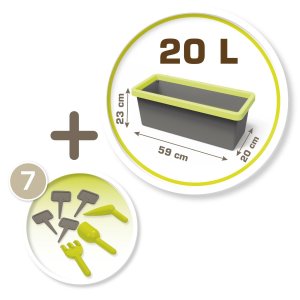 Truhlík na květiny nebo zeleninu, obsah 20 litrů. Součástí 4 zapichovací značky, vypichovák, hrabičky a lopatička. Zóna zadržující vodu, dno lze navrtat podle potřeby. Rozměry truhlíku 59 x 21,5 x 24 cm.