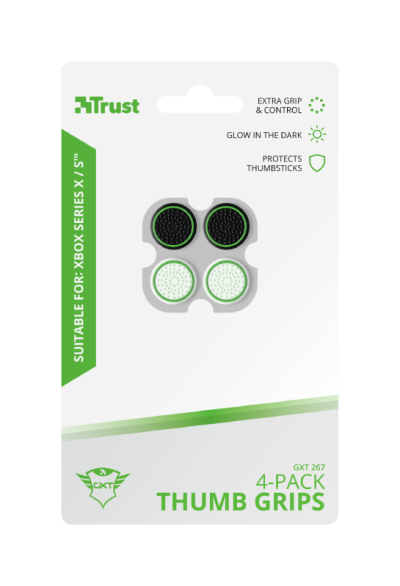 Trust GXT 267 4-pack Thumb Grips pro Xbox. Sada 4 palcových gripů pro váš ovladač Xbox Series X pro extra úchop a kontrolu. Máte novou konzoli Xbox Series X nebo Xbox Series S? Vítejte v hraní nové generace! Aby se vám váš nový ovladač dobře uchopil, jsou zde tyto Trust Thumb Grips. Tato sada má celkem 4 návleky z nichž dva svítí ve tmě, což vám pomůže udržet palce na analogových páčkách i v noci.