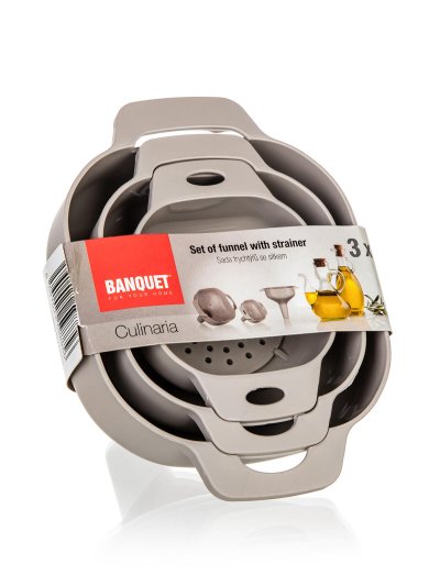 Sada plastových trychtýřu se sítkem CULINARIA slouží k pohodlnému nalévání tekutin do nádob s úzkými hrdly i jejich cezení díky sítku, které je možno vložit do každé velikosti.
