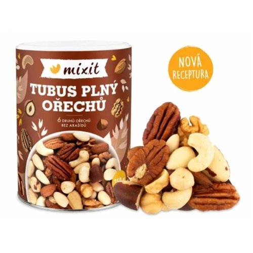 V jednom tubusu najdete jádra mandlí, jádra pražených lískových ořechů, jádra kešu ořechů, jádra para ořechů, jádra pekanových ořechů a jádra vlašských ořechů.