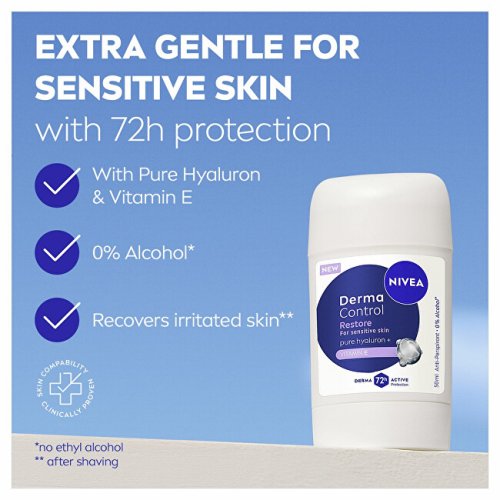 Sháníte účinný a zároveň šetrný antiperspirant, který si poradí i s velmi citlivou pokožkou? Inovativní složení s pečujícím vitamínem E chrání před podrážděním a kyselina hyaluronová hydratuje pokožku. Vyzkoušejte tuhý antiperspirant Derma Control Restore s ochranou před potem.