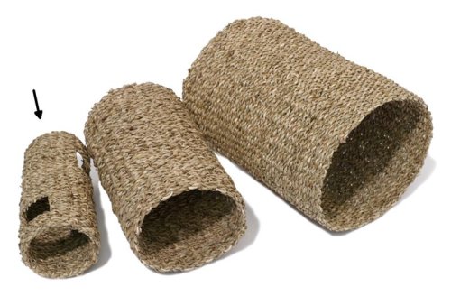 Hračka z 100% přírodního materiálu – mořské trávy. Tunel má několik využití – hračka k probíhání či jako úkryt na odpočinek. Hračka je vhodná pro králíky, potkany, fretky a hlodavce. Hračku je možné žvýkat. Na výrobu tunelu s postranními otvory nebyla použita žádná lepidla či spony. Tunel z mořské trávy je k dispozici ve třech velikostech. Rozměry: 20 x 9 cm (délka x průměr).