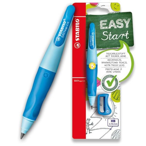 inovativní, ergonomický design tužky speciálně navržený pro děti, které se učí psát, * tvarovaná zóna úchopu z příjemného protiskluzového materiálu, * stiskací mechanismus, * trendy barevné kombinace a jmenovka na každé tužce, * extra silná tuha tvrdosti HB (číslo 2) - průměr tuhy 3,15 mm, * vyměnitelná náplň, * součástí balení ergonomické ořezávátko v ergonomickém designu, [mechanická tužka 3,15 mm][pro leváky], Vyměnitelné extra silné HB tuhy. , Mechanická tužka STABILO EASYergo je doplněk rolleru STABILO EASYoriginal, který píše jako plnící pero.