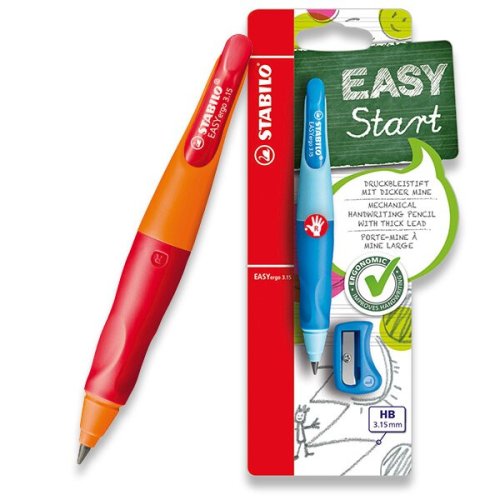 • inovativní, ergonomický design tužky speciálně navržený pro děti, které se učí psát, * tvarovaná zóna úchopu z příjemného protiskluzového materiálu, * stiskací mechanismus, * trendy barevné kombinace a jmenovka na každé tužce, * extra silná tuha tvrdosti HB (číslo 2) - průměr tuhy 3,15 mm, * vyměnitelná náplň, * součástí balení ergonomické ořezávátko v ergonomickém designu, [mechanická tužka 3,15 mm][pro praváky], Vyměnitelné extra silné HB tuhy. Ořezávátko EASY ergo., Mechanická tužka STABILO EASYergo je doplněk rolleru STABILO EASYoriginal, který píše jako plnící pero.