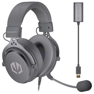 Herní sluchátka s 53mm měniči, odnímatelným mikrofonem s potlačením šumu, externí 7.1 USB zvukovou kartou a vyměnitelnými náušníky z paměťové pěny.