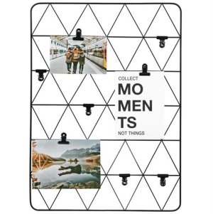 Kovová nástěnka na fotky, zavěšení na zeď, uchycení fotografií, pohlednic, poznámek a vzkazů pomocí černých kovových svorek, jednoduchý design – ideální do každé domácnosti.