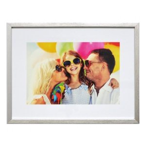 Vyrobeno z plastu Skleněný přední kryt, zadní strana z HDF desky Lze postavit nebo zavěsit (stojací podpěra a poutko) Rozměr: 300 x 400 mm Barva: stříbrná