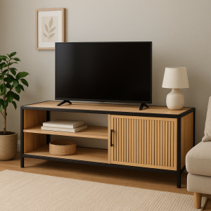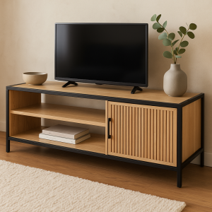 Moderní kombinace černého kovu a přírodní dýhy zajišťuje elegantní vzhled vhodný do obývacího pokoje, pracovny nebo chodby.