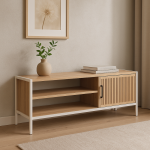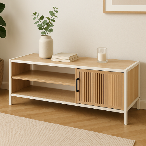 Stylová skříňka s bílýmkovovým rámem, vybavená MDF policemi a dveřmi z přírodní MDF dýhy, s 3 úložnými vrstvami pro praktické uložení drobných předmětů.