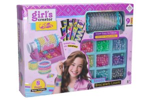 Tvorba náramků s navlékačem. Obsahuje navlékač na tvorbu náramků, šablony se vzory, různé barvy korálků.