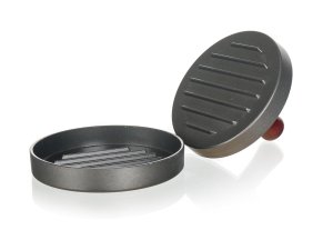 Forma na výrobu hamburgerů z mletého masa vyrobená z litého hliníku a opatřená nepřilnavým povrchem doplněna dřevěným madlem.