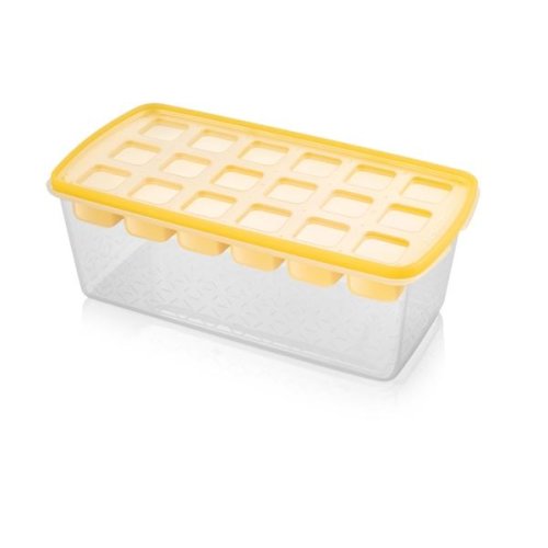 Kombinuje klasické silikonové tvořítko uzavřené víčkem s prostorným zásobníkem pro uchování a podávání ledových kostek, zaručuje, že voda během přenášení a přípravy ledu v mrazničce z tvořítka nevytéká