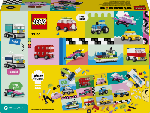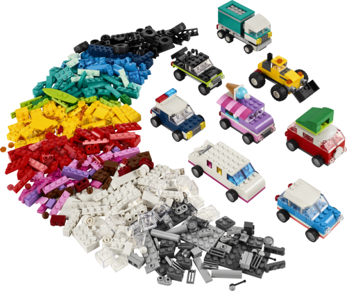 S touto stavebnicí s 900 kostkami, speciálními dílky, 52 koly a jednoduchými návody se děti mohou vrhnout do stavění modelu policejního auta, zmrzlinářského vozu, čtyřkolky, čelního nakladače, nákladního auta, kombi osobního auta, terénního vozu a limuzíny. Malí stavitelé mohou upravovat modely podle vlastních stylů, přidávat parádní detaily nebo barevné ozdoby a vytvářet zcela nová vozidla. Součástí je 10 inspirativních tipů na stavění. Děti najdou návody také v aplikaci LEGO Builder, kde lze přibližovat a otáčet modely a sledovat postup.