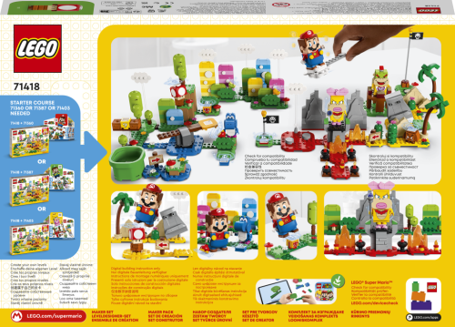 Malí stavitelé mohou přidat další detaily a hloubku do svých úrovní LEGO® Super Mario™ se stavebnicí Tvořivý box – set pro tvůrce (71418). Obsahuje sestavitelné stromy, květiny, hory, houby, pyramidy, vlajku označující kontrolní bod a spoustu dalších prvků, které dětem připomenou travnaté, pouštní a lávové úrovně Super Mario™. Parádní dárek pro děti od 6 let, které vlastní některý ze startovacích setů (71360, 71387 nebo 71403 – podmínka pro hraní). Dále se lze těšit na 3 plody, krabici s dárky, Super Mushroom s akčním prvkem a na 3 postavy LEGO Super Mario: Wendy, Modrého Yoshiho a Goombu.
