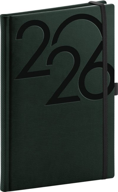 Týdenní diář Ajax 2026 v zelené barvě. Jemně strukturovaný povrch s atypickým reliéfem je vhodný pro všechny typy ražeb. Diář má zakulacené rohy, poutko na tužku a elastickou gumičku. Týdenní rozvrh s česko-slovenským kalendáriem a doplňkovou angličtinou, němčinou, maďarštinou a ruštinou.