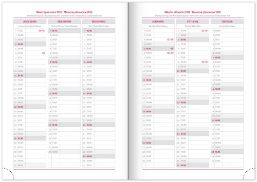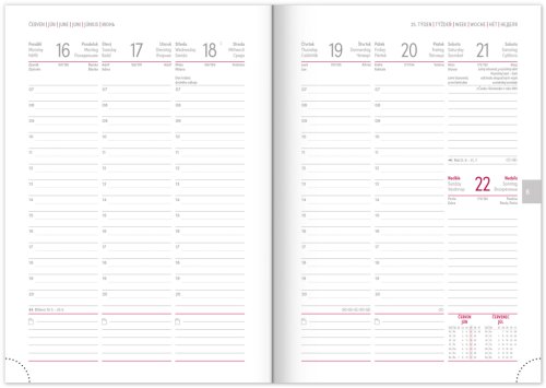 Týdenní diář Aprint 2025 formátu B5 v červené barvě. Nová kolekce vsadila na osvědčené barvy, které doplňuje nová ražba letopočtu. Týdenní rozvrh s česko-slovenským kalendáriem a doplňkovou angličtinou, němčinou, maďarštinou a ruštinou.