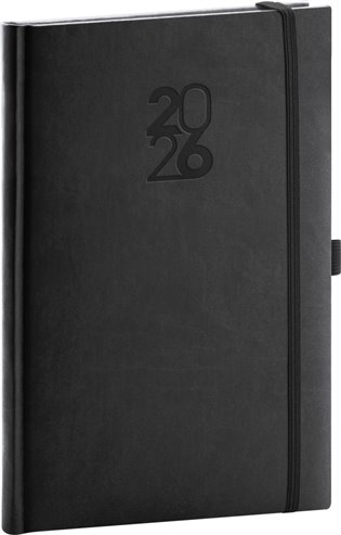 Týdenní diář Aprint Top 2026 v černé barvě. Rozšíření oblíbené řady Aprint o variantu s gumičkou na zavírání a poutkem na tužku. Týdenní rozvrh s česko-slovenským kalendáriem a doplňkovou angličtinou, němčinou, maďarštinou a ruštinou.