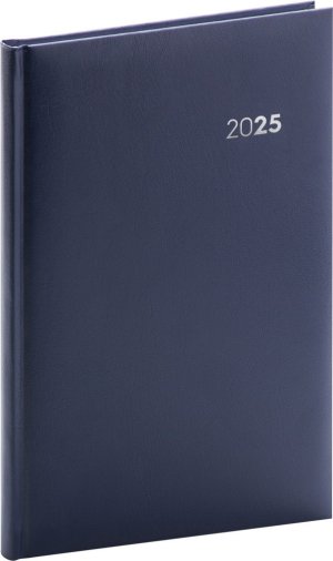 Plánovací týdenní diář Balacron 2025 formátu B5 v tmavě modrém provedení, doplněný o stříbrný letopočet.