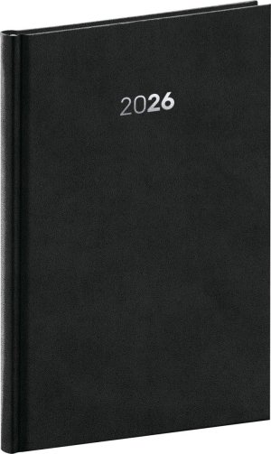 Plánovací týdenní diář Balakon 2026 v černém provedení, doplněný o stříbrný letopočet.