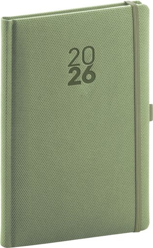 Týdenní diář Diamante 2026 v olivové barvě. Povrch diáře má jemnou strukturu připomínající výbrus diamantu a je ideální pro všechny typy ražeb. Diář má zakulacené rohy, poutko na tužku a elastickou gumičku. Týdenní rozvrh s česko-slovenským kalendáriem a doplňkovou angličtinou, němčinou, maďarštinou a ruštinou.
