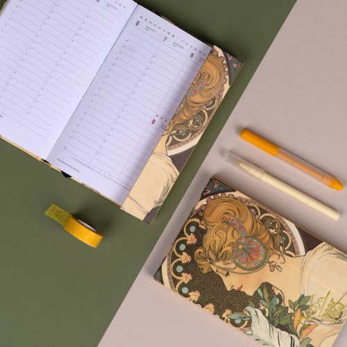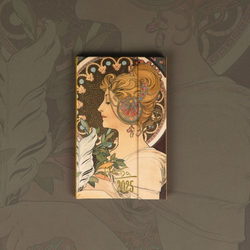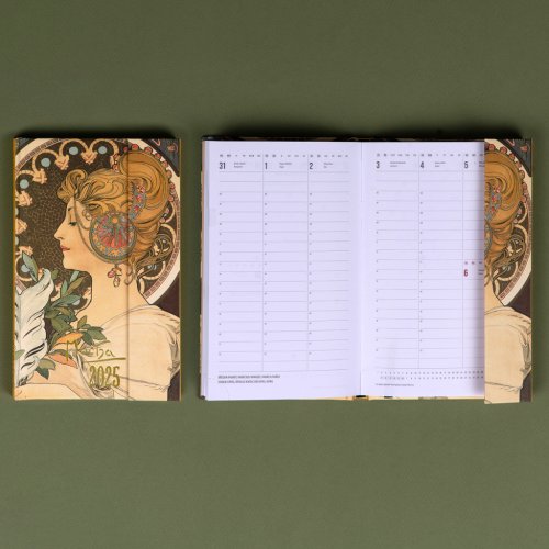 Šestijazyčný týdenní diář s magnetickým uzavíráním obsahuje přehled mezinárodních svátků, seznam českých a slovenských jmen, přehled roku 2025 a 2026, dodatečné stránky na poznámky a kapsičku na zadní předsádce. Sloupcové rozvržení s prostorem pro poznámky na každý den. Diář je v designu obrazu oblíbeného secesního malíře Alfonse Muchy.