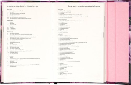 Týdenní diář s praktickým magnetickým uzavíráním je ideální volbou pro ty, kteří chtějí mít své plány přehledně pod kontrolou. Nabízí sloupcové rozvržení jednotlivých týdnů s dostatkem prostoru pro každodenní poznámky. Součástí jsou praktické měsíční přehledy, ideální pro plánování dovolených či prázdnin, a také seznam českých a slovenských svátků a jmenin.