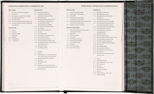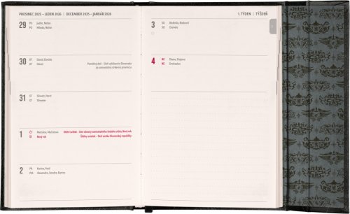 Týdenní diář s praktickým magnetickým uzavíráním je ideální volbou pro ty, kteří chtějí mít své plány přehledně pod kontrolou. Horizontální rozložení s českým a slovenským kalendáriem ve verzi týden na dvou stranách s prostorem pro poznámky. Součástí jsou praktické měsíční přehledy, ideální pro plánování dovolených či prázdnin, a také seznam českých a slovenských svátků a jmenin.