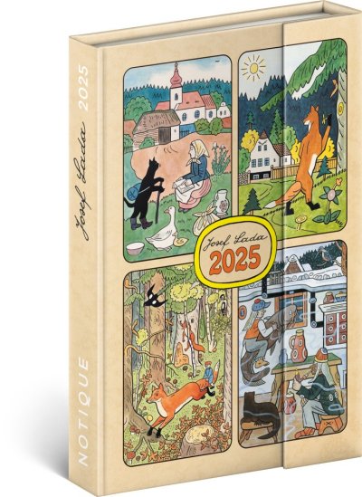 Šestijazyčný týdenní diář s magnetickým uzavíráním obsahuje přehled mezinárodních svátků, seznam českých a slovenských jmen, přehled roku 2025 a 2026, dodatečné stránky na poznámky a kapsičku na zadní předsádce. Sloupcové rozvržení s prostorem pro poznámky na každý den. Diář je v designu ilustrací Josefa Lady.