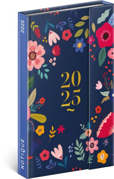 Šestijazyčný týdenní diář s magnetickým uzavíráním obsahuje přehled mezinárodních svátků, seznam českých a slovenských jmen, přehled roku 2025 a 2026, dodatečné stránky na poznámky a kapsičku na zadní předsádce. Sloupcové rozvržení s prostorem pro poznámky na každý den. Diář je v designu s motivem květin na modrém pozadí.