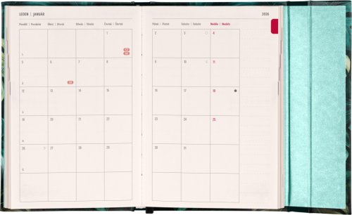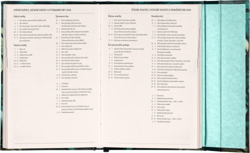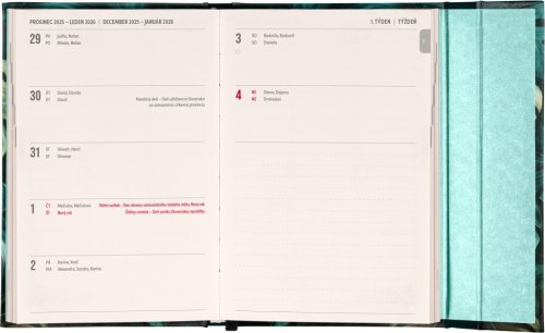 Týdenní diář s praktickým magnetickým uzavíráním je ideální volbou pro ty, kteří chtějí mít své plány přehledně pod kontrolou. Horizontální rozložení s českým a slovenským kalendáriem ve verzi týden na dvou stranách s prostorem pro poznámky. Součástí jsou praktické měsíční přehledy, ideální pro plánování dovolených či prázdnin, a také seznam českých a slovenských svátků a jmenin.