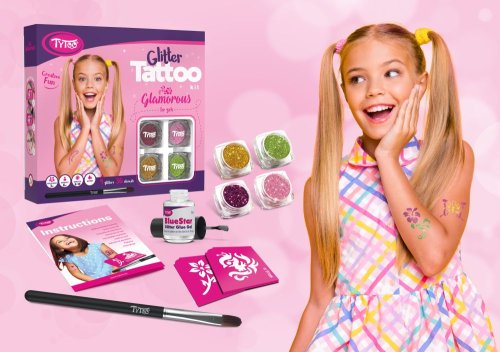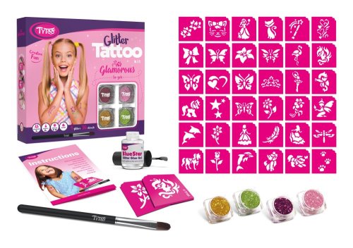 Větší sada nejoblíbenějších dívčích vzorů. Vzory: 36 ks. Barva: 4 ks. Vzor obvykle vydrží na kůži 8 – 18 dní. Délka této doby do velké míry závisí na typu kůže a míře opatrnosti, s jakou k tetování přistupujete. Třpytivé tetování je odolné vůči vodě, dá se však lehce odstranit alkoholem nebo dětským olejíčkem. Větší sady obsahují více nástrojů: Pohyblivé oči/samolepící kamínky: Hotový vzor můžete přizdobit. Naneste malé množství lepidla na samolepící kamínky a přitlačte jej na kůži. Přejeme vám hodně zábavy!