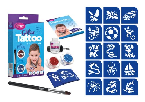 Nejpopulárnější klučičí vzory. Vzory: 15 ks. Barva: 2 ks. Vzor obvykle vydrží na kůži 8 – 18 dní. Délka této doby do velké míry závisí na typu kůže a míře opatrnosti, s jakou k tetování přistupujete. Třpytivé tetování je odolné vůči vodě, dá se však lehce odstranit alkoholem nebo dětským olejíčkem. Větší sady obsahují více nástrojů: Pohyblivé oči/samolepící kamínky: Hotový vzor můžete přizdobit. Naneste malé množství lepidla na samolepící kamínky a přitlačte jej na kůži. Přejeme vám hodně zábavy!