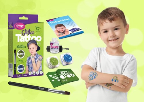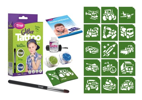 Různé typy dopravních prostředků. Vzory: 15 ks. Barva: 2 ks. Vzor obvykle vydrží na kůži 8 – 18 dní. Délka této doby do velké míry závisí na typu kůže a míře opatrnosti, s jakou k tetování přistupujete. Třpytivé tetování je odolné vůči vodě, dá se však lehce odstranit alkoholem nebo dětským olejíčkem. Větší sady obsahují více nástrojů: Pohyblivé oči/samolepící kamínky: Hotový vzor můžete přizdobit. Naneste malé množství lepidla na samolepící kamínky a přitlačte jej na kůži. Přejeme vám hodně zábavy!