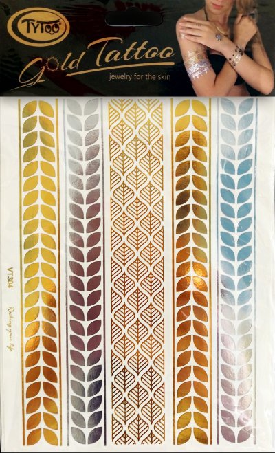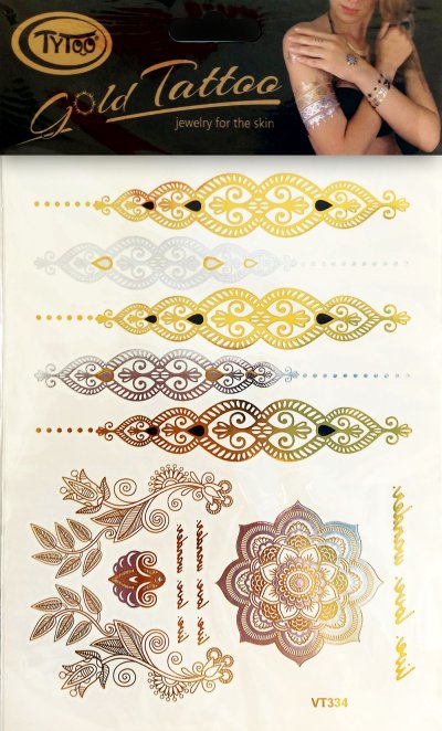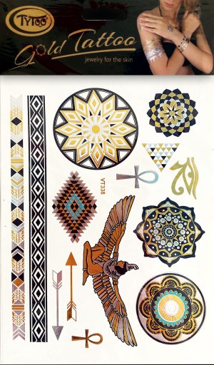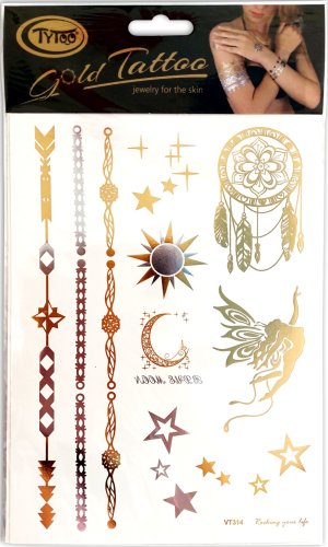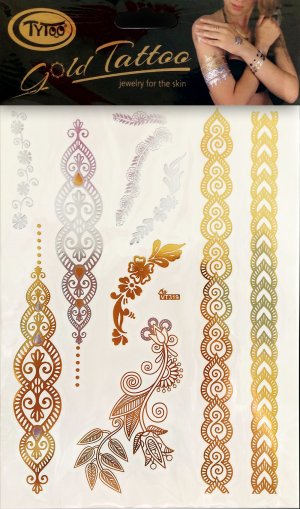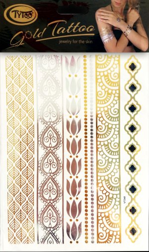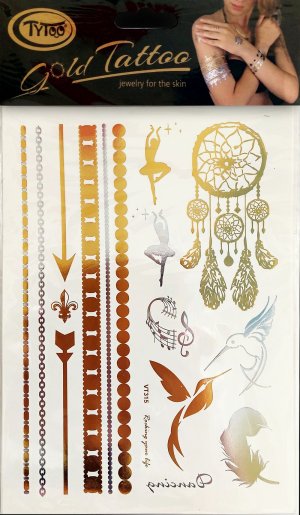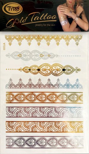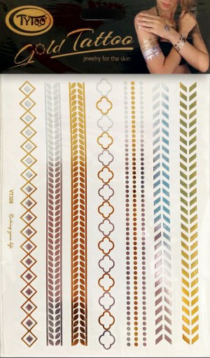 Zlaté tetování je klenot vaší pokožky. Tetovací náramky můžete použít na zápěstí, paži či okolo kotníku. Vytvořte speciální zlaté tetování během několika sekund! Trvanlivost: 2-7 dní v závislosti na typu pleti a použití! Tetování je odolné vůči vodě, dá se však lehce odstranit alkoholem nebo dětským olejíčkem. Velikost archu je 21x15 cm. Vhodné od 3 let.